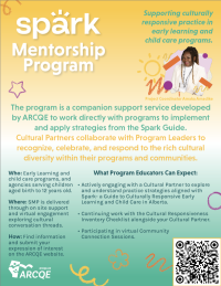 The Spark Mentorship Program is a companion support service developed by the Alberta Resource Centre for Quality Enhancement (ARCQE) to work directly with programs to implement and apply Spark Guide strategies. Cultural Partners collaborate with Program Leaders to recognize and respond to the rich cultural diversity in their programs and communities.